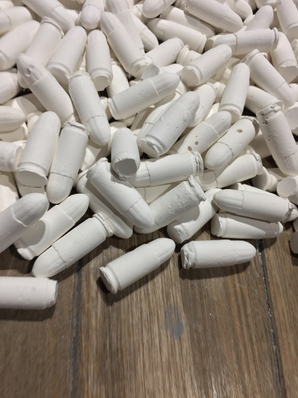 Visitors walking through the UCF Art Gallery see a pile of white accumulated on the floor, resembling packing foam. On closer inspection, the white pieces are revealed to be plaster cast bullets being dispensed from a tall white sculpture.
